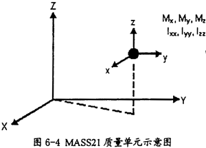 此單元為一個(gè)有六自由度的質(zhì)量單元。此單元的第一個(gè)不同的坐標(biāo)方向上可以施加不同的質(zhì)量大小和轉(zhuǎn)動(dòng)慣量。質(zhì)量單元是由單個(gè)節(jié)點(diǎn)、單元坐標(biāo)方向的集中質(zhì)量系數(shù)、單元坐標(biāo)軸的旋轉(zhuǎn)慣性所決定的。為了在加入質(zhì)量單元后不影響系統(tǒng)的慣性屬性,在此單元的實(shí)常數(shù)設(shè)定中慣性量應(yīng)設(shè)定的非常�。ㄈ缧∮�10-4)。單元如圖6-4所示。