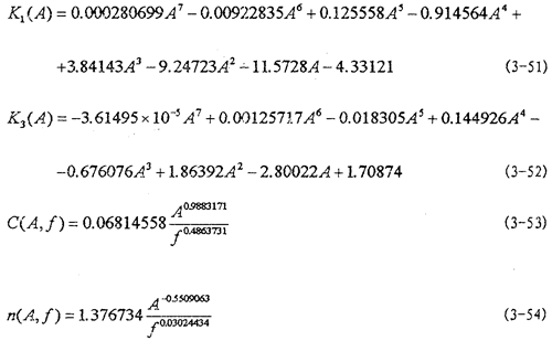 然后用線性參數(shù)辨識法和非線性參數(shù)辨識法,根據(jù)上面已經得到的各個工況下K1(A),K3(A),K5(A),C(A,f)和n(A,f)的數(shù)值對(3-48)、(3-49)、(3-50)式中各參數(shù)進行辨識,將辨識得到各參數(shù)代入(3-48)、(3-49)和(3-50)式得: