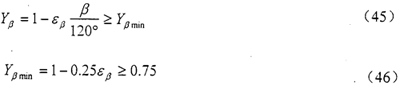 螺旋角系數(shù)Yβ是考慮螺旋角造成的接觸線傾斜對(duì)齒根應(yīng)力產(chǎn)生影響的系數(shù)。其數(shù)值可以通過式(45)和(46)計(jì)算。