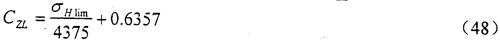 其中,在850N/mm2≤σH1im≤1200N/mm2范圍內,CZL可由式(47)算得。當σH1im<850N/mm2時取CZL=0.83;當σHlim>1200N/mm2時取CZL=0.91