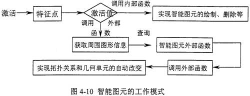 通過(guò)對(duì)特征點(diǎn)的激活,首先判斷激活值,是調(diào)用外部函數(shù)還是調(diào)用內(nèi)部函數(shù),如果是調(diào)用內(nèi)部函數(shù),則根據(jù)激活值,調(diào)用某個(gè)內(nèi)部函數(shù),實(shí)現(xiàn)智能圖元自身的操作,如刪除、放大、旋轉(zhuǎn)等等;如果是調(diào)用外部函數(shù),則再獲取周?chē)鷪D元信息,并以此查詢外部函數(shù)庫(kù),得到某個(gè)外部函數(shù),則調(diào)用此外部函數(shù),實(shí)現(xiàn)智能圖元的拓?fù)潢P(guān)系和幾何單元信息的改變。(如圖4-11所示)