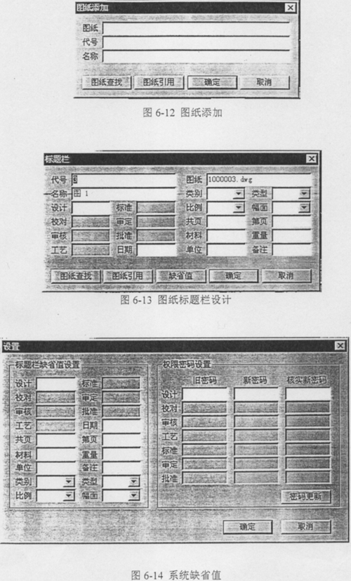 根據(jù)相應項的密碼輸入,再選擇/添加/刪除產(chǎn)品,見圖6-10,進行圖紙管理系統(tǒng)的主畫面(見圖6-11),進而對產(chǎn)品選擇、圖紙進行添加、刪除(圖6-12)及其編輯,明細表、標題欄的設(shè)計(圖6-13)以及一些系統(tǒng)缺省值(圖6-14)的固定等等;