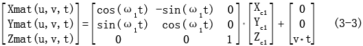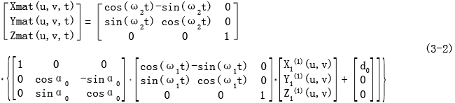 設(shè)已知接觸線為C1,它可以由三個(gè)一維數(shù)組Xc1,Yc1,Zc1表示,螺旋運(yùn)動(dòng)的角速度為ω,軸向移動(dòng)速度為v,則由它生成的螺旋面可以用如下的坐標(biāo)變換表示為: