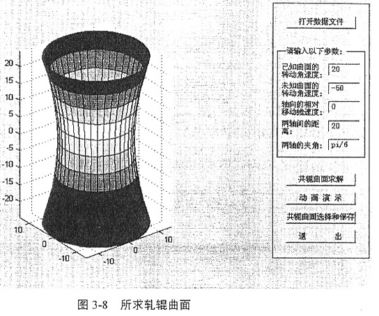 應(yīng)用軟件Conjugater1.0求解軋輥曲面:已知軋件曲面是圓柱面,輸入表達(dá)式或各節(jié)點(diǎn)坐標(biāo)值后,可以顯示其曲面形狀如圖3-6所示;根據(jù)各節(jié)點(diǎn)值以及輸入的運(yùn)動(dòng)和相對(duì)位置參數(shù),進(jìn)行共軛曲面求解運(yùn)算,可以得到與已知曲面共軛的兩個(gè)曲面如圖3-7所示,這兩個(gè)曲面都滿足共軛條件的;根據(jù)實(shí)際需要,取與已知曲面外共軛的共軛曲面(如圖3-8),這就是滿足條件的軋輥曲面。