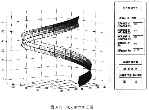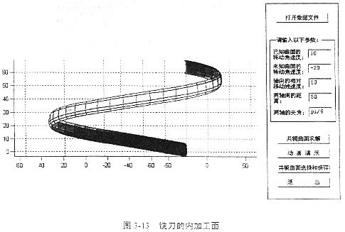 借助于軟件Conjugater1.0求銑刀加工的過程與求解軋輥曲面的過程相同。輸入輸出界面和結(jié)果如圖3-10、圖3-11、圖3-12、圖3-13所示。最后得到如圖的兩個(gè)螺旋面,這兩個(gè)螺旋面都是滿足共軛條件的,圖3-12表示銑刀在工件實(shí)體的外圓加工所得的曲面,圖3-13表示銑刀在工件的內(nèi)壁加工所得的曲面。應(yīng)用時(shí)可根據(jù)實(shí)際情況選取。