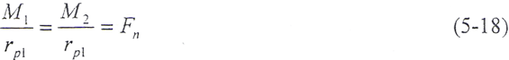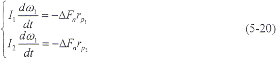 如果在t=0的瞬時,由于干擾載荷的作用,輪齒的變形量增大△δ,則齒上的載荷也獎增加△Fn,當(dāng)轉(zhuǎn)矩M1、M2為定值時,由齒輪的平衡條件可知,齒輪的角速度ω將發(fā)生周期性變化,而載荷和變形也以同一頻率變化。由(5-17)式和(5-18)式,得
