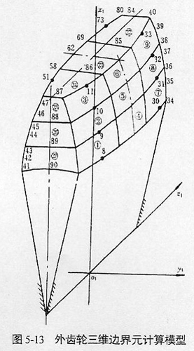 對共軛鼓形齒輪用邊界元法進(jìn)行接觸問題的研究與分析時,首先只需對邊界即齒廓表面進(jìn)行單元劃分,然后對每個嚙合點即接觸區(qū)進(jìn)行局部細(xì)分,不需像有限元法那樣,需從表到里將整個齒輪輪齒進(jìn)行劃分。