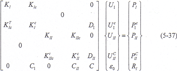 若用三角分解算法進(jìn)行分解消元運算,使與接觸面有關(guān)的剛度矩陣變換成為單位矩陣,同時求出相應(yīng)的系數(shù)矩陣的改變DⅠ、DⅡ和載荷向量的改變PⅠ′、PⅠC、PⅡ′、PⅡC,則矩陣方程成為