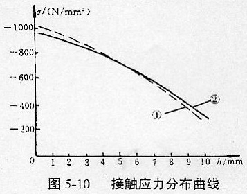 基于上述接觸問題的有限元與邊界元計算模型和前面的載荷分析,對一模數(shù)m=5mm、齒數(shù)Z=40、分度圓壓力角a=20°、分度圓直徑d=200mm、齒寬b=20mm、齒輪材料的彈性常數(shù)E=2.1×105N/mm2、泊松比μ=0.3、傳遞扭矩Mn=300N·m的共軛鼓形齒聯(lián)軸器鼓形齒輪Ⅰ進(jìn)行了接觸應(yīng)力計算,其簡圖如圖5-9所示。該問題接觸應(yīng)力的有限元與邊界元數(shù)值解和接觸應(yīng)力分布曲線分別如表5-1、圖5-10所示。曲線①(虛線)為接觸應(yīng)力的有限元解;曲線②(實線)為接觸應(yīng)力的邊界元解。