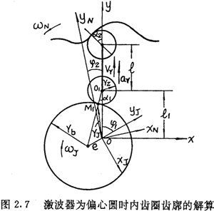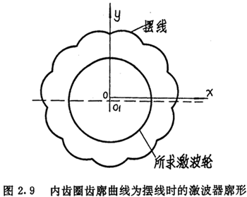 由上面可以看出,在選定激波器廓形TJ=TJ(θ)的情況下,正反兩種結(jié)構(gòu)所得到的內(nèi)齒圈齒廓方程式(2.21)與式(2.22)在形式上是不同的。對于反向結(jié)構(gòu),用-θ代換激波器方程中的θ,即令TJ=TJ(-θ),則θ增加的方向為順時針方向,若激波器廓形可表示為偶函數(shù),即TJ(—θ)=TJ(θ),讓激波器按逆時針方向轉(zhuǎn)動,則所得的內(nèi)齒圈齒廓方程式完全與(2.21)式相同。因而齒廓方程式(2.22)與式(2.21)雖然形式不同,但實質(zhì)是一樣的。區(qū)別在于參數(shù)吸的取值方向,今后以式(2.21)作為內(nèi)齒圈齒廓的標準形式。