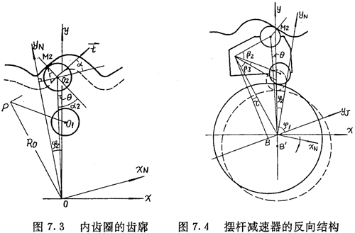 和推桿減速器一樣,當理論擺動機構(gòu)數(shù)目比內(nèi)齒圈齒數(shù)少,即ZC=ZN-1時,機構(gòu)成為圖7.4所示的反向結(jié)構(gòu),在此結(jié)構(gòu)中,擺桿外滾子中心在與內(nèi)齒圈固聯(lián)的坐標系(o,xN,yN)中的軌跡方程是: