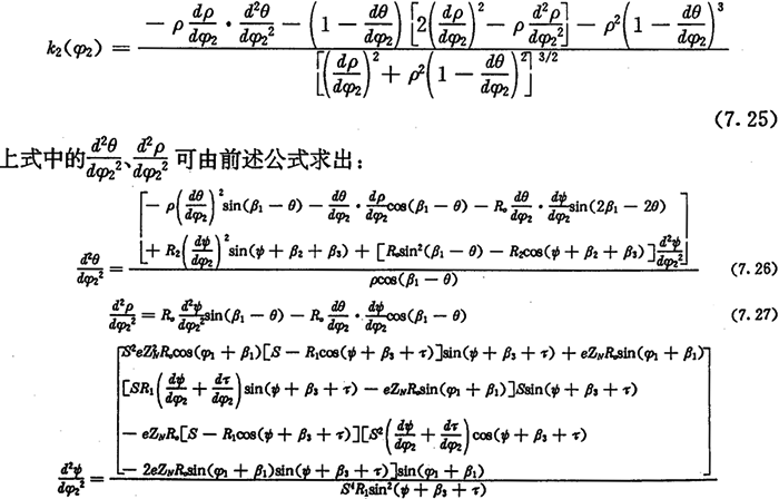 設(shè)k2為外滾子中心軌跡曲線的相對曲率,將(7.8)式中的xo、yo代入(2.23)式,并整理后可得