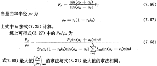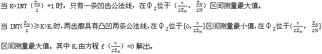 由式(7.71)及式(7.73)可得齒廓AB上與跨槽數(shù)為K的齒郭具有公法線的點的條件式為: