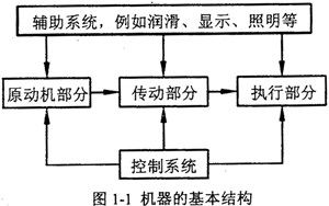 機器的發(fā)展經(jīng)歷了一個由簡單到復雜的過程,人類為滿足生產(chǎn)及生活的需要,設計和制造出了種類繁多、功能各異的機器。機器類型多種多樣,基本結(jié)構(gòu)可以歸結(jié)為如圖1-l所示。機器的功能各異,所要求的運動形式千變?nèi)f化,并且需要克服的阻力、阻力矩也因機器工作情況而異。一般說來,原動機的運動形式、運動及動力參數(shù)都是有限的,而且是確定的。這樣必須解決把原動機的運動形式、運動及動力參數(shù)轉(zhuǎn)變?yōu)閳?zhí)行部分所需的運動形式、運動及動力參數(shù)的問題。這就必須靠機器的傳動部分來完成,即機器中的傳動部分是機器為完成各種功能所必需的基本構(gòu)成。