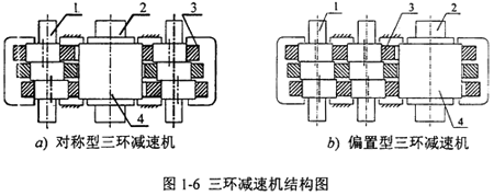 由于三環(huán)減速機的研究歷史較短,作為一種新生事物,它的發(fā)展道路也必定是曲折的。我國生產(chǎn)的三環(huán)減速機的結(jié)構(gòu)如圖1-6所示,a)是對稱型三環(huán)減速機,b)是偏置型三環(huán)減速機,三環(huán)減速機由兩根高速偏心輸入軸1,低速輸出軸2,三片為齒環(huán)板3和外齒輪4構(gòu)成。三片內(nèi)齒環(huán)板3偏心安裝在兩根高速軸1上,它們都與外齒輪4相嚙合,外齒輪4安裝在輸出軸上,各軸均平行配置,利用三相并列平行雙曲柄機構(gòu)來克服死點。雙曲柄機構(gòu)的最大缺點就是存在死點位置,即當曲柄與連桿共線時,機構(gòu)處于運動不確定位置,此時傳動角為零,機構(gòu)無法運動,因此必須采取雙曲柄軸動力輸入、多相并列雙曲柄機構(gòu)和多曲柄機構(gòu)來克服死點。