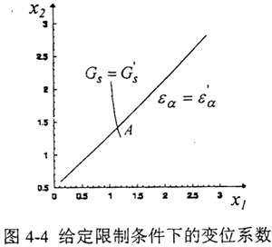 某項限制條件,可以曲線的形式表示在xl,x2坐標(biāo)系內(nèi),若把每個限制條件都以曲線形式繪于x1,x2坐標(biāo)系內(nèi),則它們的交點A便對應(yīng)著這對齒輪的變位系數(shù),如圖4-2所示。