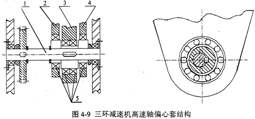 在三環(huán)減速機(jī)中,高速輸入軸上要加工三對偏心軸頸,依次安裝三個環(huán)板。由于中間一塊環(huán)板的安裝比較困難,一般采用圖4-9所示的偏心套結(jié)構(gòu),高速軸1與偏心套2、3、4之間通過平鍵聯(lián)接,軸與偏心套之間為過渡配合H7/k6,而偏心套通過環(huán)板軸承5與環(huán)板相聯(lián)。