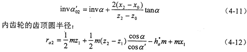 變位系數(shù)的確定是少齒差內(nèi)嚙合傳動設(shè)計的關(guān)鍵。文獻(xiàn)中所述的內(nèi)、外齒輪都按滾齒加工的計算公式推導(dǎo)出的變位系數(shù)的迭代公式,與內(nèi)齒輪插齒、外齒輪滾齒的實際加工情況不一致,雖然能夠保證給定的重合度和齒廓不重迭干涉系數(shù)的要求,但是不能保證標(biāo)準(zhǔn)頂隙,而且一般得出的嚙合角也比較大。本章推導(dǎo)了少齒差內(nèi)嚙合傳動實際加工情況的變位系數(shù)的迭代公式,解決了上述問題。