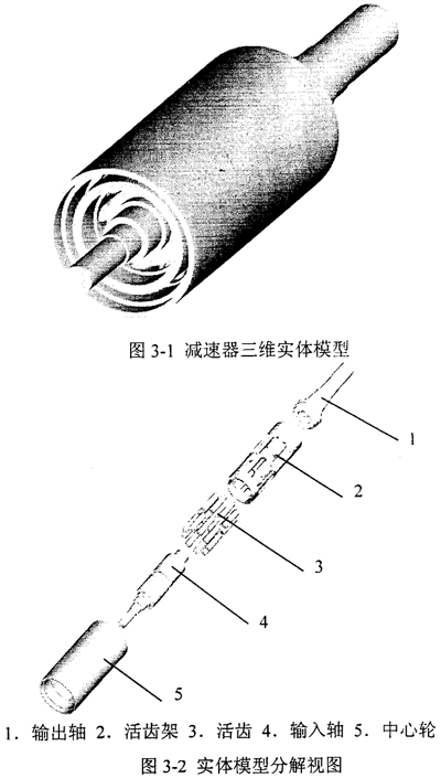 無(wú)論進(jìn)行有限元分析還是虛擬樣機(jī)仿真,我們只需研究與減速器工作直接相關(guān)的波發(fā)生器、活齒、活齒架和中心輪等關(guān)鍵零件,而忽略端蓋、端套、軸承等輔助零件,據(jù)此建立減速器三維實(shí)體模型及其分解圖見(jiàn)圖3-1和圖3-2。