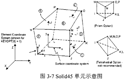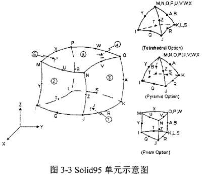 根據(jù)問(wèn)題的性質(zhì)和模型的復(fù)雜程度,選用Solid95單元(見(jiàn)圖3-3)。該單元是三維的20個(gè)節(jié)點(diǎn)的結(jié)構(gòu)單元,可以在保證計(jì)算精度的前提下允許實(shí)體中不規(guī)則的形狀存在。每個(gè)節(jié)點(diǎn)存在三個(gè)自由度:X、Y和Z方向的移動(dòng),可應(yīng)用于塑性、脆性、大變形和大應(yīng)變等問(wèn)題。