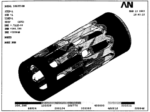 3.3.2.1 活齒架的強(qiáng)度分析 采用平臺(tái)為Pentium IV 1.7GHz CPU 、128MDDR SDRAM內(nèi)存、NVIDIA Geforce2 MX/MX4OO顯卡、Windows XP操作系統(tǒng)和ANSYS5.7 軟件進(jìn)行分析求解。