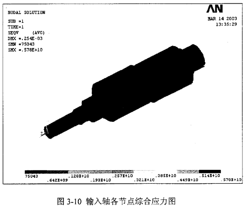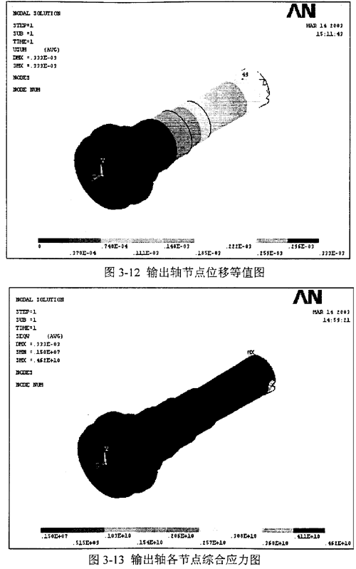 同樣,輸出軸劃分網(wǎng)格并加載后見(jiàn)圖3-11,各節(jié)點(diǎn)位移圖和綜合應(yīng)力圖分別見(jiàn)圖3-12和圖3-13。查詢可知輸出軸了大位移在節(jié)點(diǎn)49處,位移值為0.333mm。平均綜合應(yīng)力為1.5MN/mm2,遠(yuǎn)小于許用應(yīng)力。