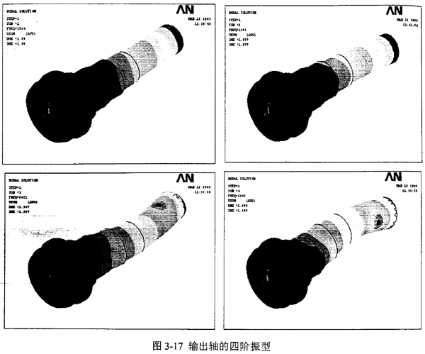 同樣劃分網(wǎng)格并施加約束的輸出軸見圖3-16。求得輸出軸的前四階固有頻率為1584Hz、1585Hz、682lHz、6847Hz,對應(yīng)的各振型見圖3-17。