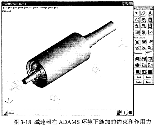 將Pro/ENGINEER建立起來的減速器三維裝配實體模型通過Mechpro接口程序?qū)階DAMS,對其添加約束和作用力情況見圖3-18,其中: