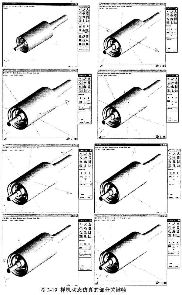 仿真開始后,ADAMS-View自動調(diào)用ADAMS-Solver進行求解,并實時地將每一幀顯示在屏幕上,形成動畫。仿真過程的部分關(guān)鍵幀見圖3-19。
