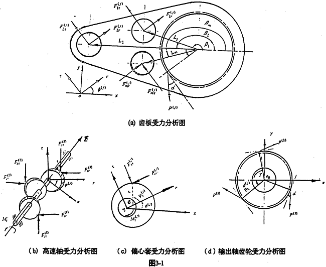 由于多相并列內(nèi)齒行星傳動的N片行星齒板結(jié)構(gòu)相同,相鄰兩片之間的相位差為2Ω/N。因此,在一個周期范圍內(nèi),各片齒板的受力情況完全一樣,故只需分析其中一片齒板即可。齒板及高速軸、輸出軸的受力分析如圖3-1所示。用動態(tài)靜力平衡法寫出機構(gòu)的動力分析基本方程為