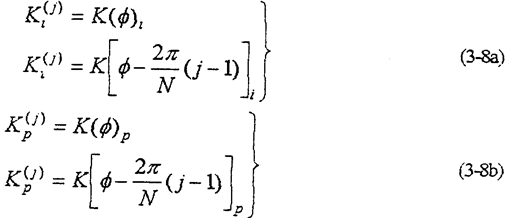 設(shè)偏心套與齒板之間的接觸變形剛度系數(shù)為K(j)i,內(nèi)嚙合齒對的變形剛度系數(shù)為K(j)P,它們除與構(gòu)件材料和幾何結(jié)構(gòu)有關(guān)外,還是機構(gòu)工況位置角φ(j)的周期函數(shù)。各相剛度系數(shù)之間的關(guān)系為