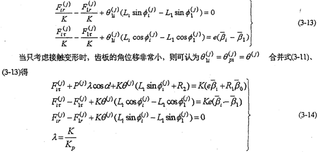 在建立位移協(xié)調(diào)補充方程時,為便于分析,忽略機構(gòu)的運動副間隙,并且只考慮偏心套與齒板高速軸孔之間的接觸變形,以及齒板與輸出齒輪輪齒之間的嚙合變形。由式(2-33)、(2-34)及式(2-35)、(2-36)、(2-37)得: