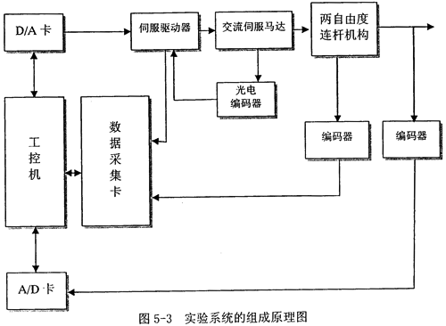 實驗方案以微機控制的交滾伺服電機為原動機之一與控制器、以兩自由度連桿機構(gòu)為實驗載體,輔以檢測系統(tǒng),建立了一個柔性速度補償裝置控制的實驗系統(tǒng)。