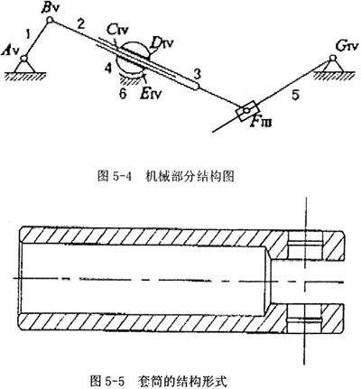 首先將原來的原理圖轉(zhuǎn)換成以下的機構(gòu)結(jié)構(gòu)圖(僅部分轉(zhuǎn)換),如圖5-4,即原來2、3構(gòu)件之間是滑塊和連桿連接,現(xiàn)改為連桿、套筒改為加一個擺動軸結(jié)構(gòu),原來滑塊3和地面連接,容易形成過約束,改為加一個擺動軸承4來和地面、套筒來連接。擺動軸承內(nèi)芯相當于一個球副,其轉(zhuǎn)動中心必為內(nèi)芯的球心,當然也是整個擺動軸承的中心。這樣便于加工查和實驗實施,而且更重要的是可防止原來原理圖中桿件連接出形成過約束。