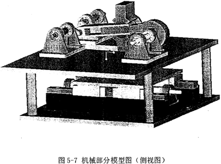 如圖5-1所示為實驗系統(tǒng)機械部分的模型圖片,為了顯示清楚,沒有配置外邊的機箱,整個機構(gòu)是完全開放式的,這樣也便于實驗觀察。該機械結(jié)構(gòu)由上下兩個機架支撐,和前面的原理圖不同,下邊機架上放置昆旋導軌構(gòu)件(未顯示伺服電機),上邊機架則是上圖所示的其余連桿機構(gòu)及其支撐架、軸承等(未顯示常速電機)。