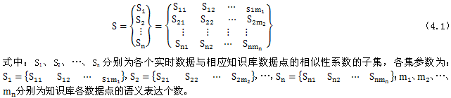 專家系統(tǒng)推理主要是從知識庫所需的數(shù)據(jù)集合D={D1、D2、…、Dn}出發(fā),根據(jù)知識庫中每一數(shù)據(jù)點相應(yīng)的一個或多個語義表達(dá)和數(shù)據(jù)范圍,將獲取實時數(shù)據(jù)與知識庫中相應(yīng)數(shù)據(jù)的語義表達(dá)和數(shù)據(jù)范圍進(jìn)行相似性分析,得出相似性系數(shù)的集合: