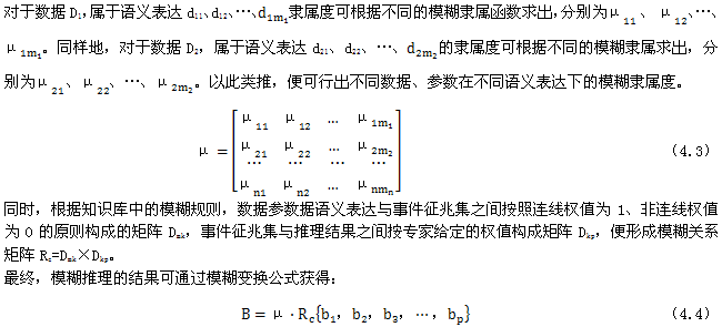 模糊邏輯主要應(yīng)用模糊規(guī)則庫進(jìn)行模糊邏輯關(guān)系運算最終得出推理結(jié)果,模糊規(guī)則庫采用圖4.6所示的專家知識庫結(jié)構(gòu)。首先對數(shù)據(jù)、參數(shù)進(jìn)行模糊化處理,進(jìn)入推理機(jī)的數(shù)據(jù)與參數(shù),根據(jù)知識庫中不同的語義表達(dá),通過合理的選擇與構(gòu)造模糊隸屬函數(shù),得出相應(yīng)的數(shù)據(jù)、參數(shù)在不同語義表達(dá)下的模糊隸屬度。