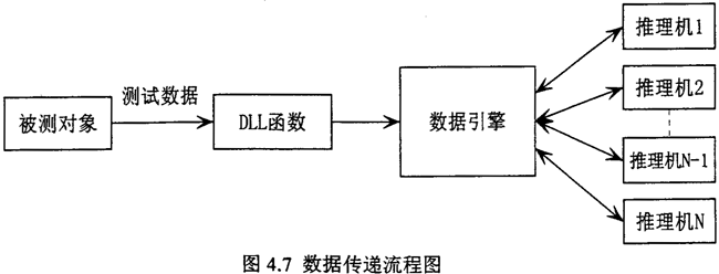 根據(jù)流程圖可知,從故障測試數(shù)據(jù)到數(shù)據(jù)引擎,有兩種數(shù)據(jù)處理方式,一種是故障測試數(shù)據(jù)由數(shù)據(jù)采集系統(tǒng)采集后,可先進(jìn)行預(yù)處理,將故障信號數(shù)據(jù)處理為推理機(jī)所需的故障特征數(shù)據(jù),然后發(fā)送出去,動態(tài)連接庫DLL函數(shù)則通過網(wǎng)絡(luò)接收這些故障特征數(shù)據(jù),同時對照推理機(jī)向數(shù)據(jù)引擎申請的故障特征變量,將申請的故障特征變量對應(yīng)的值找出,按數(shù)據(jù)引擎規(guī)定的格式反送給申請數(shù)據(jù)的推理機(jī)。另一種是故障測試數(shù)據(jù)由數(shù)據(jù)采集系統(tǒng)采集后,按一定格式直接發(fā)送出去,動態(tài)連接庫DLL函數(shù)則通過網(wǎng)絡(luò)接收這些故障信息數(shù)據(jù),然后再進(jìn)行數(shù)據(jù)預(yù)處理,將故障信息數(shù)據(jù)處理為推理機(jī)所需的故障特征數(shù)據(jù),同時對照推理機(jī)向數(shù)據(jù)引擎申請的故障特征變量,將申請的故障特征變量對應(yīng)的值找出,再按數(shù)據(jù)引擎規(guī)定的格式反送給申請數(shù)據(jù)的推理機(jī)。