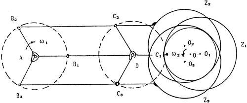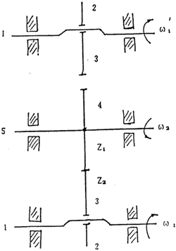 三環(huán)減速器實(shí)質(zhì)上就是一種雙曲柄輸入式、內(nèi)齒輪作圓周平動(dòng)而外齒輪用于輸出的少齒差行星齒輪傳動(dòng)機(jī)構(gòu)。原理如圖2-1所示。雙曲柄機(jī)構(gòu)1-1以轉(zhuǎn)速ω1輸入運(yùn)動(dòng),通過(guò)連桿2及與連桿相固連的內(nèi)齒輪了將運(yùn)動(dòng)傳給外齒輪4,并通過(guò)外齒輪4將運(yùn)動(dòng)傳遞給5ω2輸出運(yùn)動(dòng)和動(dòng)力,其傳動(dòng)比為: