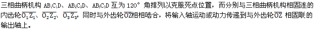 眾所周知,雙曲柄機(jī)構(gòu)的最大缺點(diǎn)就是存在死點(diǎn)位置,即當(dāng)曲柄,與連桿共線時(shí),機(jī)構(gòu)處理運(yùn)動(dòng)不確定位置,其傳動(dòng)角為零,機(jī)械無(wú)法運(yùn)動(dòng)。為了克服死點(diǎn)位置,目前已出現(xiàn)了三種解決方法:其一是在同一行星輪上布置多套雙曲柄機(jī)構(gòu)的方法:其二是采用雙曲柄動(dòng)力輸入式方法;基三是采用多相并列式雙曲柄機(jī)構(gòu)來(lái)克服死點(diǎn)的方法。三環(huán)減速器就是用三相并列雙曲柄機(jī)構(gòu)來(lái)克服死點(diǎn)位置,如圖2-2所示。