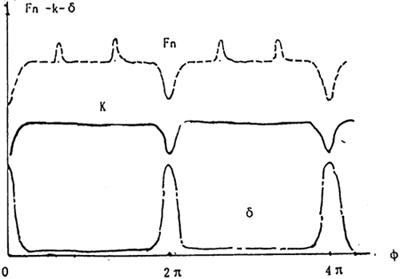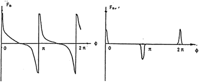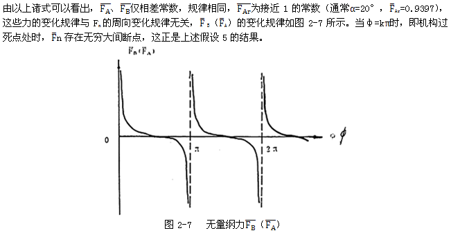 理論上,該力僅在ф=Kπ點(diǎn)產(chǎn)生,而FA、FB將在此點(diǎn)處趨于無(wú)窮大。考慮實(shí)際結(jié)構(gòu)的彈性變形等因素,F(xiàn)Br應(yīng)在ф=Kπ的一轉(zhuǎn)角領(lǐng)域內(nèi)ф=Kπ±△ф產(chǎn)生,而FB、FA在該鄰域內(nèi)由正(或負(fù))向峰值過(guò)零轉(zhuǎn)變?yōu)樨?fù)(正)向峰值,如圖2-10所示。這是因?yàn)镕B、FA在死點(diǎn)位置附近迅速增大產(chǎn)生的彈性變形也會(huì)使環(huán)板產(chǎn)生微小反轉(zhuǎn)角度,而導(dǎo)致FBr的產(chǎn)生,顯然該微小角度領(lǐng)域的大小以及FB、FA所能達(dá)到的峰值決于環(huán)板的剛度。剛度越大,該領(lǐng)域越小,F(xiàn)B、FA峰值越大,F(xiàn)Br的大小與嚙合力及無(wú)量綱參數(shù)(γ+β)成正比。一般情況下,高速重載的三環(huán)減速器、環(huán)板機(jī)構(gòu)的剛度嚙合力等均較大,因此死點(diǎn)處受到的沖擊越大,且沖擊脈沖寬度小(反比于角速度),激振頻率更寬,更易激起廣泛的共振。