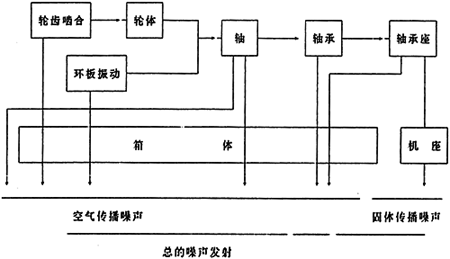 從圖中可知,固體傳播噪聲是由傳遞中的振動(dòng)激勵(lì)引起的,環(huán)板沖擊及輪齒嚙合振動(dòng)通過(guò)軸、軸承、軸承座傳向箱體和機(jī)座;引起振動(dòng)而輻射的噪聲通過(guò)箱壁向外輻射,此外,由軸的振動(dòng)引起的噪聲的一部分直接向箱體外輻射。