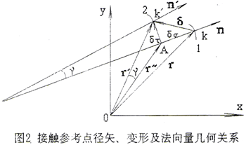 通常情況下,變形量相對于曲面參考點徑矢的大小為微小量,其切向分量更小,主要由撓曲變形引起。由(2-6-1)式知,γ值非常小。一般情況下,可忽略這一法線方向的改變,認為變形后的接觸參考點法線方向不變,以便于求解。