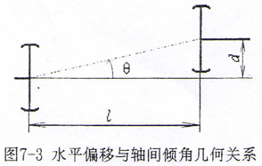 實(shí)驗(yàn)裝置簡(jiǎn)圖如圖7-2所示,實(shí)驗(yàn)裝置實(shí)物照片見(jiàn)附錄。實(shí)驗(yàn)裝置由固定端和調(diào)整端組成。被測(cè)試鼓形齒聯(lián)軸器的兩個(gè)外齒輪分別裝于軸1和軸2上。軸1、軸2分別由兩個(gè)滾動(dòng)軸承支承。軸1上安裝有加載齒輪,加載桿上裝有與加載齒輪模數(shù)齒數(shù)相同的內(nèi)齒輪,便于調(diào)整加載桿的位置。軸2上裝有鎖緊板,鎖緊板與止動(dòng)支座聯(lián)接,以承受所加的轉(zhuǎn)矩。這樣,當(dāng)加載桿端頭加載時(shí),被試鼓形齒聯(lián)軸器即承受所加轉(zhuǎn)矩的作用。安裝時(shí)保持軸1、軸2水平等高。當(dāng)兩軸在水平面內(nèi)同軸線時(shí),則被測(cè)試鼓形齒聯(lián)軸器內(nèi)外齒輪同軸線,無(wú)軸間傾角。當(dāng)調(diào)整端平行移動(dòng)一個(gè)距離,則內(nèi)齒輪與兩外齒輪產(chǎn)生相同的軸間傾角。幾何關(guān)系如圖7-3所示。