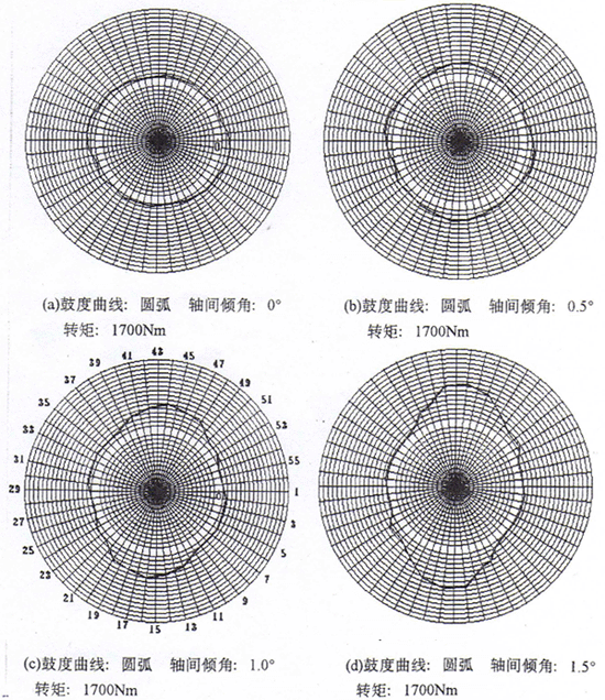 5.圓弧鼓度曲線與優(yōu)化鼓度曲線的測(cè)試結(jié)果相比較,在無(wú)軸間傾角的情況下,二者的最大應(yīng)變無(wú)大的差異,只是分布狀態(tài)有所不同,這是由各種誤差的綜合影響所造成的。當(dāng)軸間傾角逐漸增大,應(yīng)變分布的最大值和最小值之差逐漸增大,但優(yōu)化鼓度曲線的差值變化較圓弧鼓度曲線的要小。當(dāng)軸間傾角超過(guò)設(shè)計(jì)軸間傾角處于最大時(shí),二者的最大應(yīng)變量之比約為2;