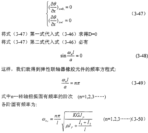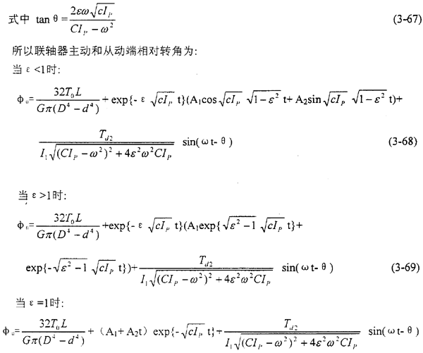 比較式(3-74),(3-75),(3-76)可知,由于 ,所以當(dāng)阻尼系數(shù)等于臨界阻尼系數(shù)時(shí),產(chǎn)生的剪切應(yīng)力最小,此時(shí) 。由于對于一定的材料制作的聯(lián)軸器,因?yàn)椴牧系淖枘崽匦允且欢ǖ�,因此在以后�?lián)軸器的設(shè)計(jì)過程中,可以通過控制兩端的轉(zhuǎn)動(dòng)慣量,或者通過改變聯(lián)軸器本身的尺寸來控制它的扭轉(zhuǎn)剛度,力求使 的值盡可能的接近阻尼系數(shù),從而減少產(chǎn)生的剪切力,提高聯(lián)軸器的工作狀態(tài)和延長聯(lián)軸器的使用壽命。