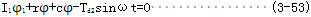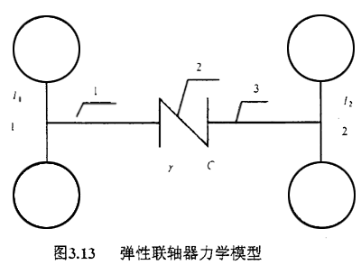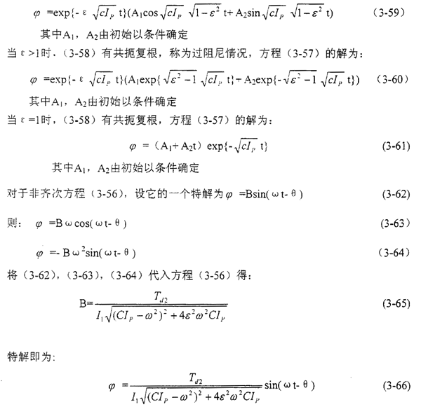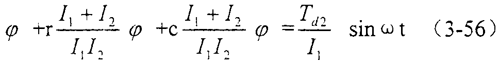 現(xiàn)單獨(dú)考慮擾動(dòng)轉(zhuǎn)矩產(chǎn)生的相對轉(zhuǎn)角φ2,目前國內(nèi)建立了圖3.13所示力學(xué)模型[2],出于橡膠件相對于兩側(cè)的鐵圈剛性很小,現(xiàn)假設(shè):(1)只有聯(lián)軸器兩側(cè)的鐵圈具有剛性,只有橡膠具有彈性和阻尼;(2)聯(lián)軸器主動(dòng)側(cè)作用有按簡諧規(guī)律變化的擾動(dòng)轉(zhuǎn)矩分量Tdlsinωt此時(shí)按照動(dòng)量矩定理,按聯(lián)軸器兩側(cè)力矩平衡條件,可以分別列出兩個(gè)圓盤的轉(zhuǎn)動(dòng)運(yùn)動(dòng)方程式,即系統(tǒng)振動(dòng)的微分方程是: