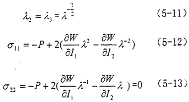 根據(jù)所取W的具體形式,可求出 的表達(dá)式,其中含有材料常數(shù),由試驗數(shù)據(jù)求得各伸長比及對應(yīng)的應(yīng)力,將多個試驗點的λ和σ11代入式(5-14),可求得這些材料常數(shù)值。