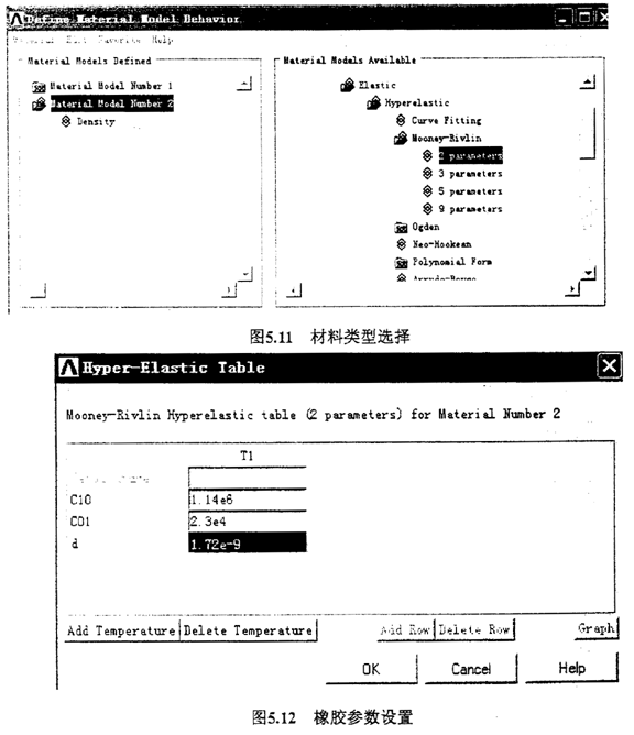 橡膠的硬度為70,通過計算確定C10和C01分別為1.14Mpa和0.023Mpa。ANSYS中參數(shù)設(shè)置如圖5.11和5.12所示,其中