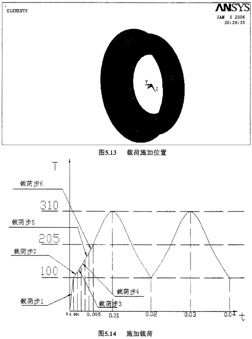 在小鐵圈端施加205-105cis314t的動載荷,為了能夠清楚地看到動態(tài)變化的過程,我們?nèi)蓚周期。在0.001秒施加第一個載荷,T1=100,迅速達(dá)到電動機(jī)工作狀態(tài)。對于正紡載荷,將每四分之一周期劃分成五小段,每一個小段作為1個載荷步,一共可分為20個載荷步。載荷點和施加過程如圖5.13和圖5.14所示: